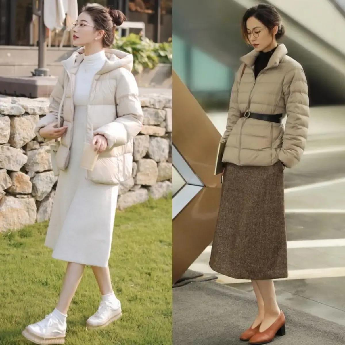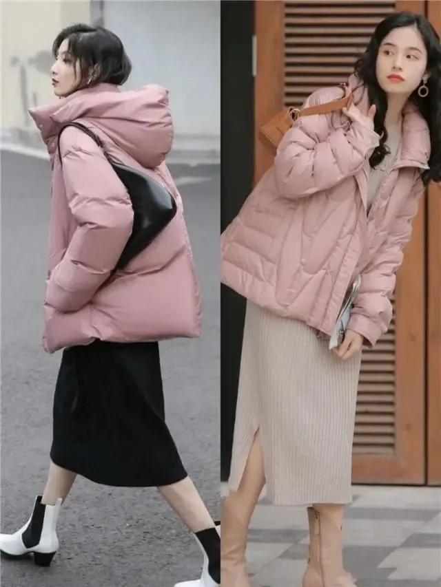如果你是00后的美少女,想让自己穿起来更有少女感的情况下,可以像下面这两位数人一样选择粉色的羽绒服来穿搭,穿在身上之后很修饰肤色,而且下半身可以用直筒半身裙来搭配,因为直筒半身裙看起来不会显得过于蓬松,更能优化你的身材比例,不过裙子的长度不要太长,尽量在膝盖3到5厘米就可以在和博主们一样,用高跟的短靴来搭配,使得你变得更加显高显瘦,活力感满满。