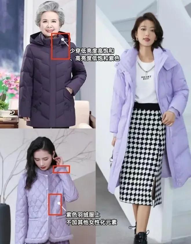 如果你真的想要穿一些比较修饰肤色,而且能让整个人看起来更有活力的衣服,颜色一定要注意少穿低亮度高饱和高亮度低饱和的紫色羽绒服,或者是羽绒服上面添加了太多的设计元素,穿起来也不好看。