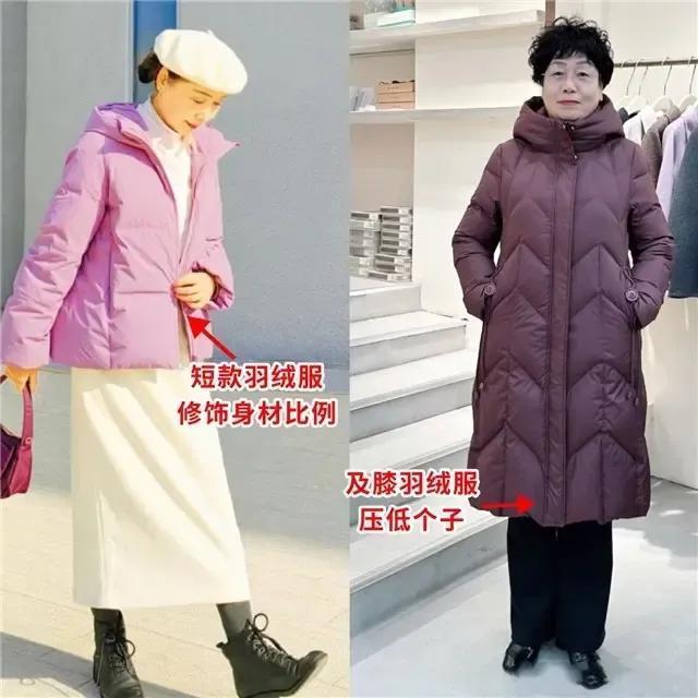 大家看下面这两位女性的穿衣对比就可以得出一个明确的答案,如果你选择的是紫色的长款羽绒服,长度已经盖过膝盖到小腿肚的位置,穿在身上之后很压个子。