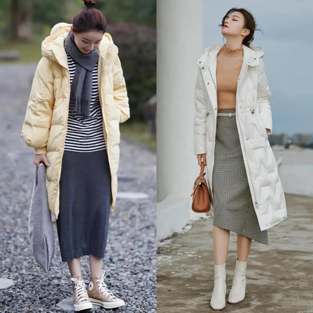 有的时候选择的衣服款式越简约,反而越容易穿出时髦感,例如下面直接选择纯黄色的长款羽绒服,内搭黑白的条纹打底衫,下半身选择灰色的半身裙,脚踩一双帆布鞋,这样的穿衣打扮休闲洋气,如果你想要穿出气质感,你就可以向右边的测绘素人博主一样,用白色的羽绒服内搭打底衫,下半身选择不对称设计的格纹自动半身裙,脚上穿一双短靴,这样的穿衣造型通勤时髦,魅力全开。